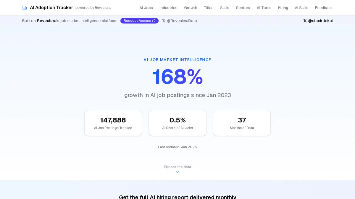 The AI Adoption Tracker provides insights into emerging job titles and growth velocity in the AI sector. By analyzing hiring trends, it helps users identify key opportunities and skills that are shaping the future of work in AI.