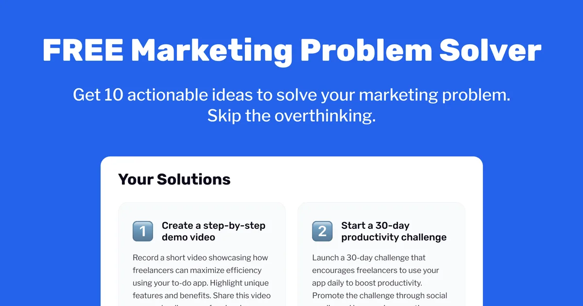 This tool generates 10 actionable ideas to tackle your marketing challenges, perfect for entrepreneurs and marketers looking for quick solutions. Skip the overthinking and get inspired in just 10 seconds with AI-generated suggestions.