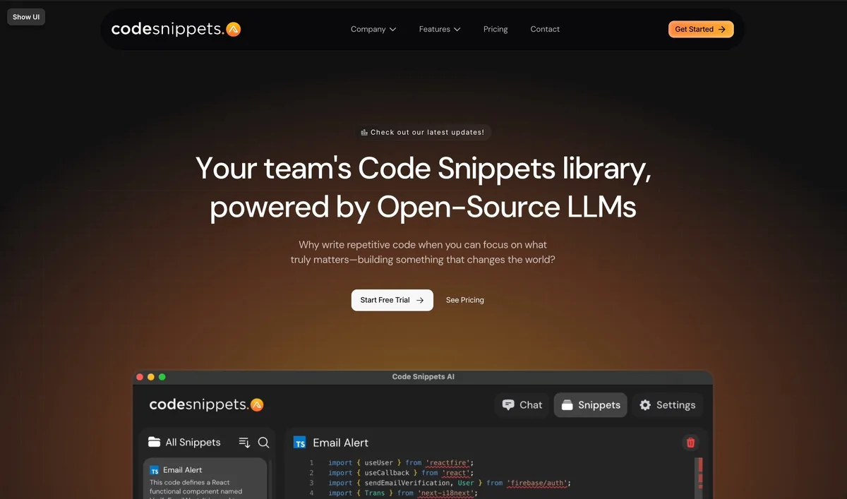 Code Snippets AI is available at Free. Visit codesnippets.ai for the latest pricing details and available plans.