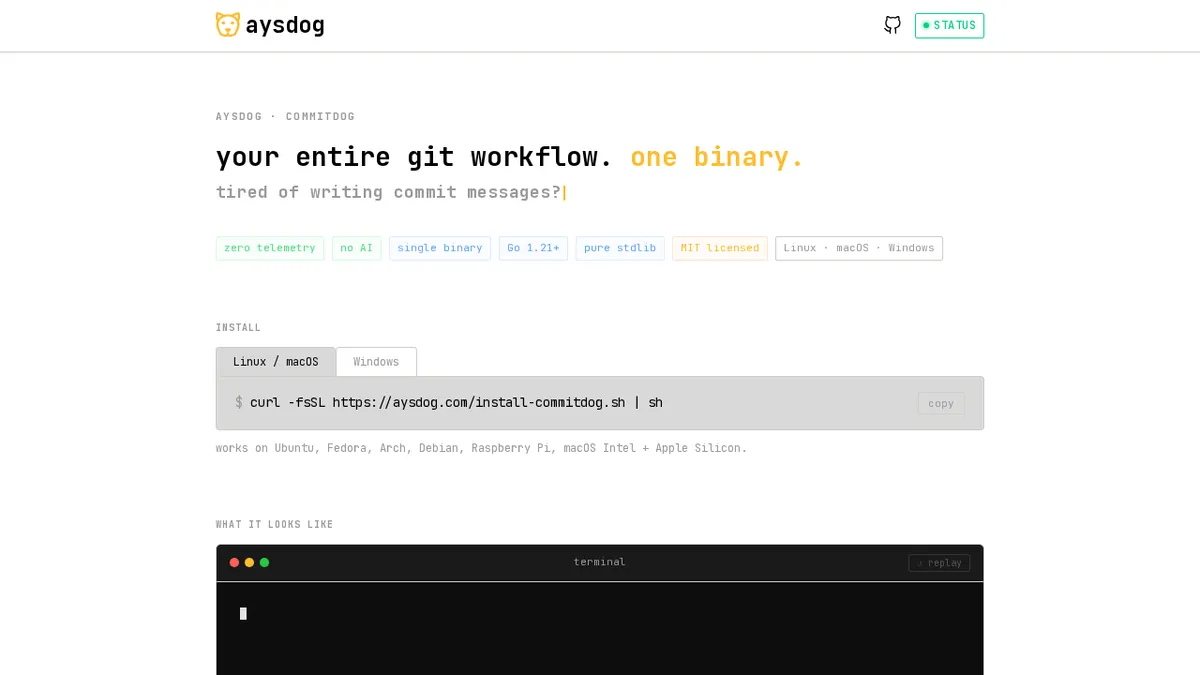 commitdog — git commit messages written for you. one binary. offers a free tier with optional paid upgrades.