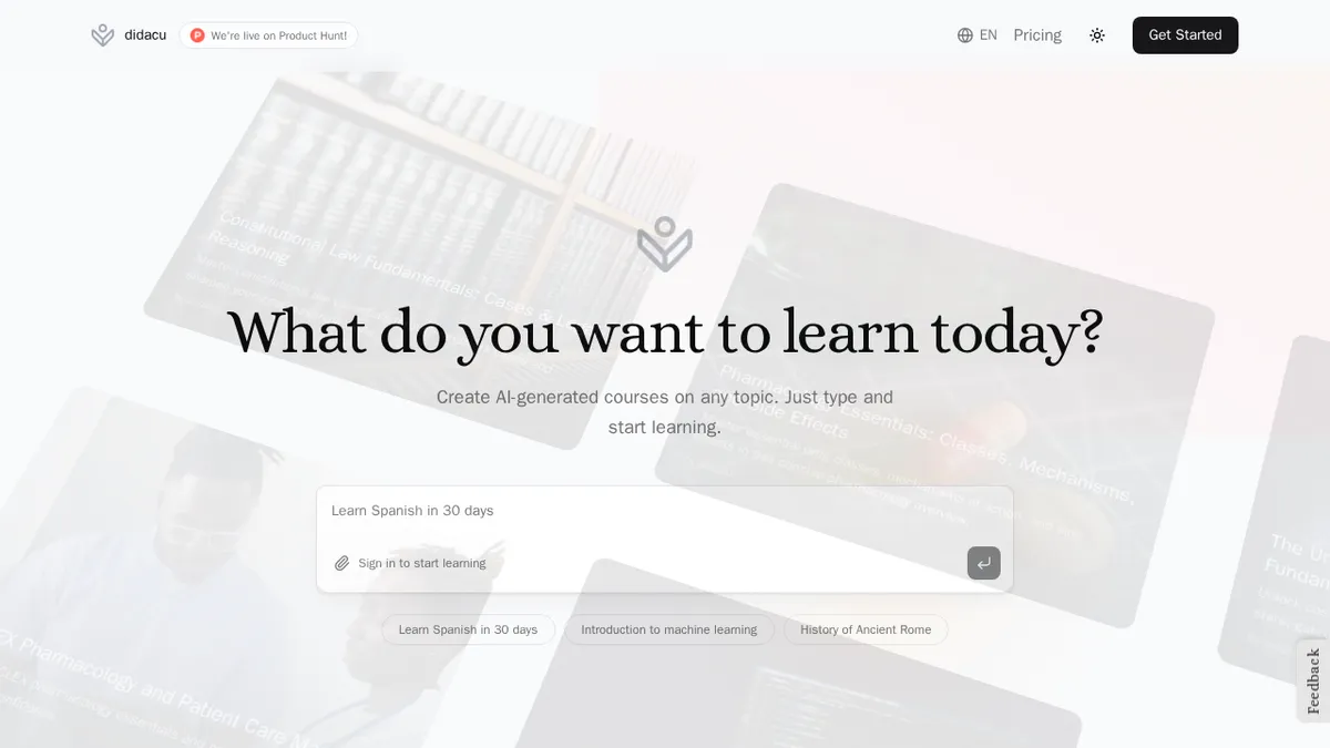 Simply describe what you want to learn, and Didacu generates a course for you. It stands out by combining AI with an intuitive interface, making course creation quick and easy.