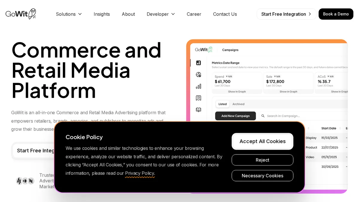GoWit - Retail Media Platform is available at Free Trial. Visit gowit.com for the latest pricing details and available plans.