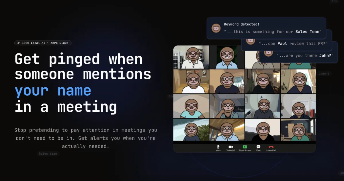 Using 100% private local AI, you’ll receive a ping whenever your name comes up in a meeting call. This means you can ignore the rest and only engage when necessary, making your workday more efficient and less stressful.