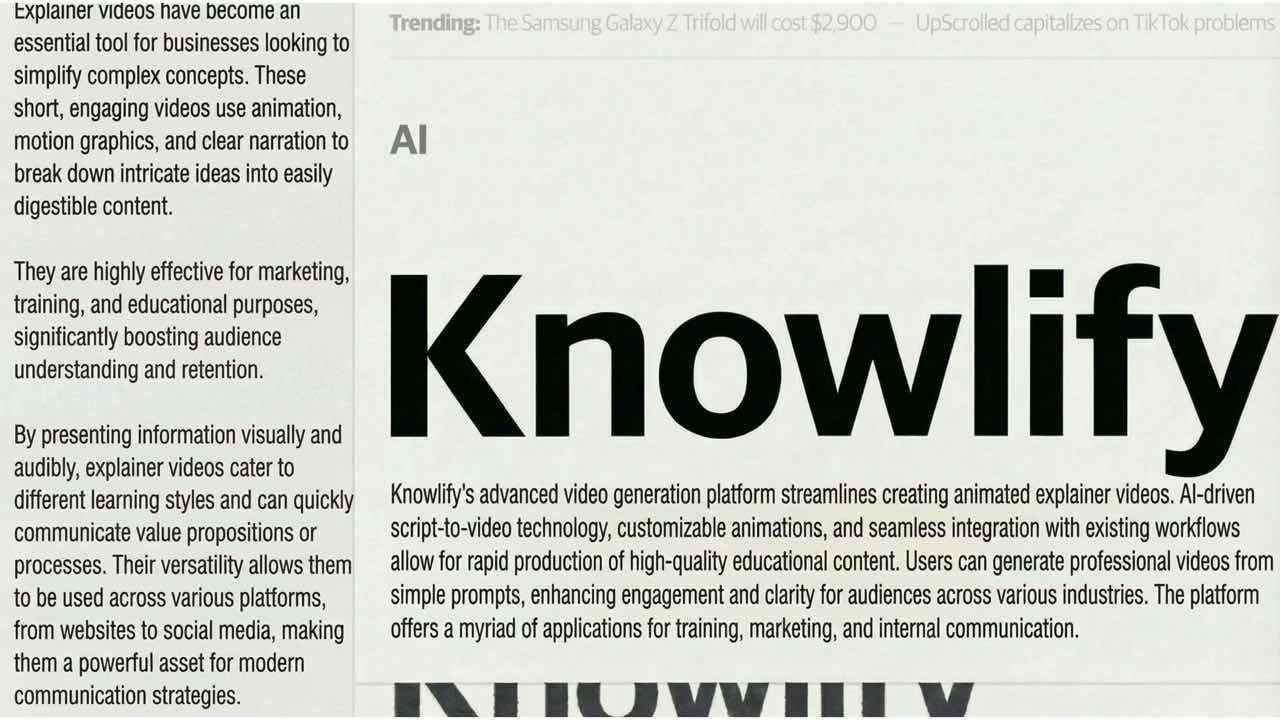 Knowlify is an AI-powered animated explainer video maker for companies. Turn documents, scripts, and ideas into professional animated videos in minutes — no design skills needed.