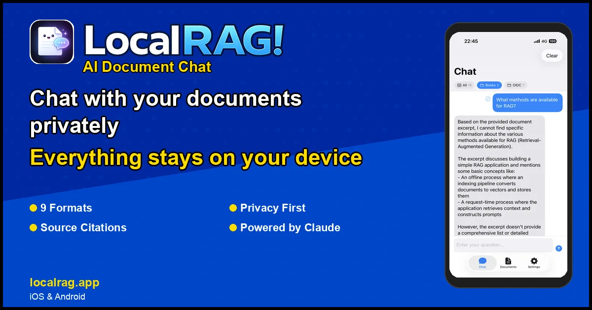 Engage with your documents like never before. LocalRAG is perfect for anyone needing quick insights from PDFs, EPUBs, and Word docs on their iPhone, iPad, or Android device.