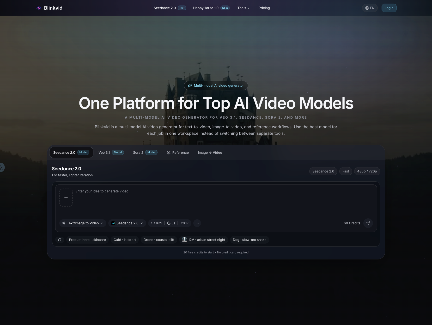 Blinkvid is a multi-model AI video generator that supports Veo 3.1, Seedance 2.0, Sora 2, and more for text-to-video, image-to-video, and reference workflows.