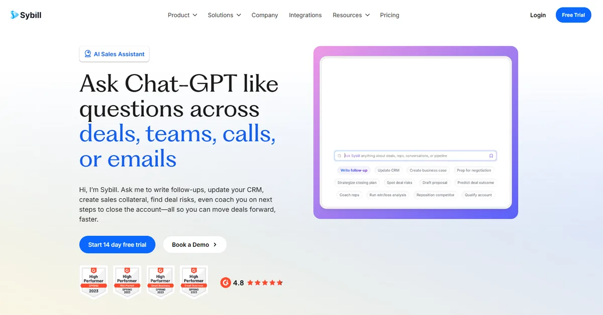 Sybill is an AI sales assistant designed for revenue teams. It answers deal questions, creates sales assets, and handles tedious tasks like meeting prep, email follow-ups, and CRM updates.